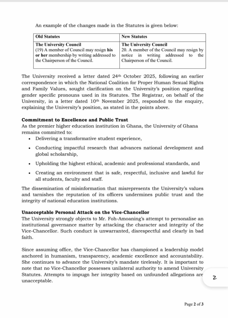 The University of Ghana (UG) has issued a forceful rebuttal to claims by prominent anti-LGBTQ+ advocate Moses Foh-Amoaning that the institution amended its statutes to endorse or admit LGBTQ+ activities, labeling the accusations as “entirely false, misleading, and defamatory.” In a detailed statement released on November 24, 2025, UG clarified that recent changes to its governing documents were merely linguistic updates to adopt gender-neutral language, and demanded an immediate retraction and public apology from Foh-Amoaning, warning of legal action if unmet. The university also slammed irresponsible media reports for amplifying unverified claims without proper verification.