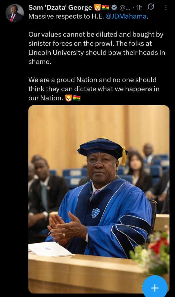 Samuel Nartey George, Member of Parliament for Ningo-Prampram, Minister for Communication, Digital Technology and Innovations, and a key sponsor of the Human Sexual Rights and Family Values Bill, 2025, strongly criticised Lincoln University following its decision to cancel President John Dramani Mahama’s visit and honorary award. In a social media post, he praised the President for what he described as upholding Ghanaian values and not compromising them for international recognition. He further condemned the University’s decision, stating that its officials should “bow their heads in shame,” and argued that Ghana’s sovereignty and cultural values should not be influenced or dictated by external actors, particularly in relation to debates around the anti-LGBTQ Bill currently before the Parliament of Ghana.